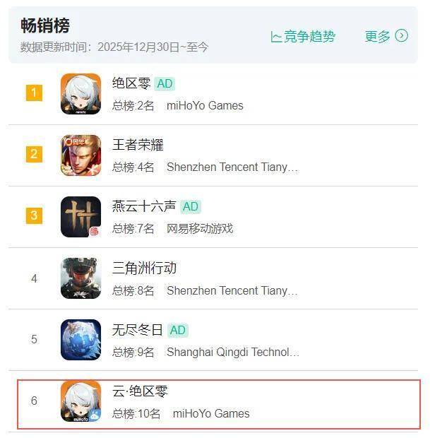 和年头岁末,来都不幽静游戏圈向,月30日就正在12,“微光引灯时”正式上线《绝区零》2.5版本,天的下昼更新当,OS游戏热销榜的榜首游戏就冲上了国区i,列第二总榜位。