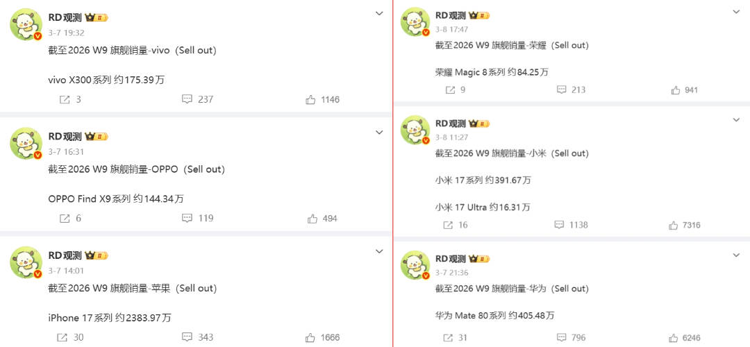 Mate 80系列旗舰销量第二是华为,5.48万台卖了约40,牌里最能打的了目前是国产物;)加起来约391.67万台幼米17系列(含Ultra,华为紧咬;v大厂O、,系列约173.39万vivo X300,9系列约144.34万OPPO Find X; 8系列低于百万名誉Magic,4.25万总共约8。