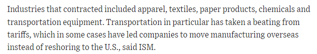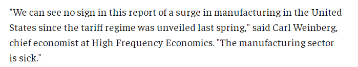 指出著作,府曾辩称美国政,国内创造业的需要之举加征闭税是维护美国,家则以为但经济学,缺正在内的布局性题目因为包含劳动力短,法还原旧日光彩美国创造业已无。温伯格(Carl Weinberg)的话体现著作征引高频经济筹商公司首席经济学家卡尔·,)这份陈说中“从(ISM,税战略出台以后我没有看到自闭,任何增进的迹象美国创造业展示,业依然病了美国创造。”